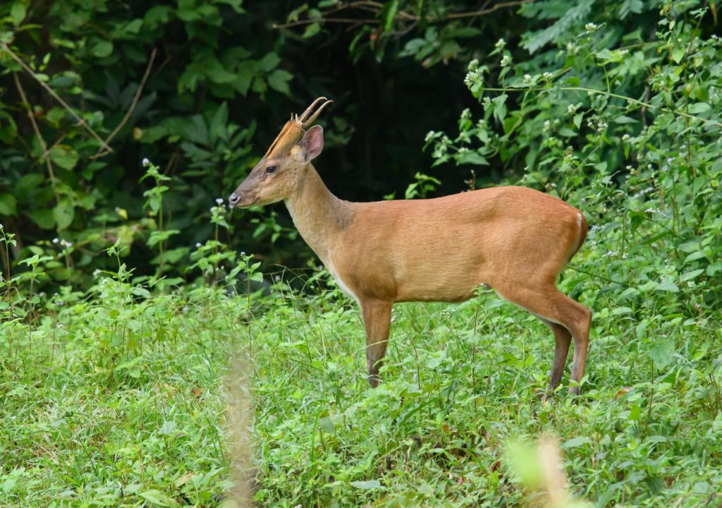 The Barking Deer, or Muntjac, is a small deer known for its distinctive barking call, which is used as an alarm signal. Native to South and Southeast Asia, it is a solitary and secretive animal that prefers dense forests and scrubland. Its small size and ability to hide make it a challenging animal to spot in the wild.